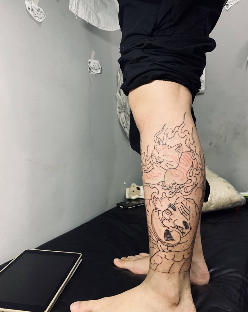 • T网红王老大花腿龙纹身图片_腿部新传统纹身图案