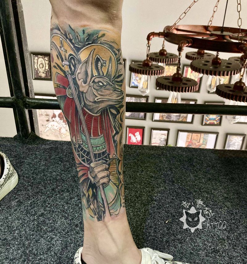 当前位置: 首页 >广西北海市纹身店-刺青猫纹身馆纹身图案>阿努比斯.纹身图片_脚部腿部New School阿努比斯埃及法老胡狼神纹身图案