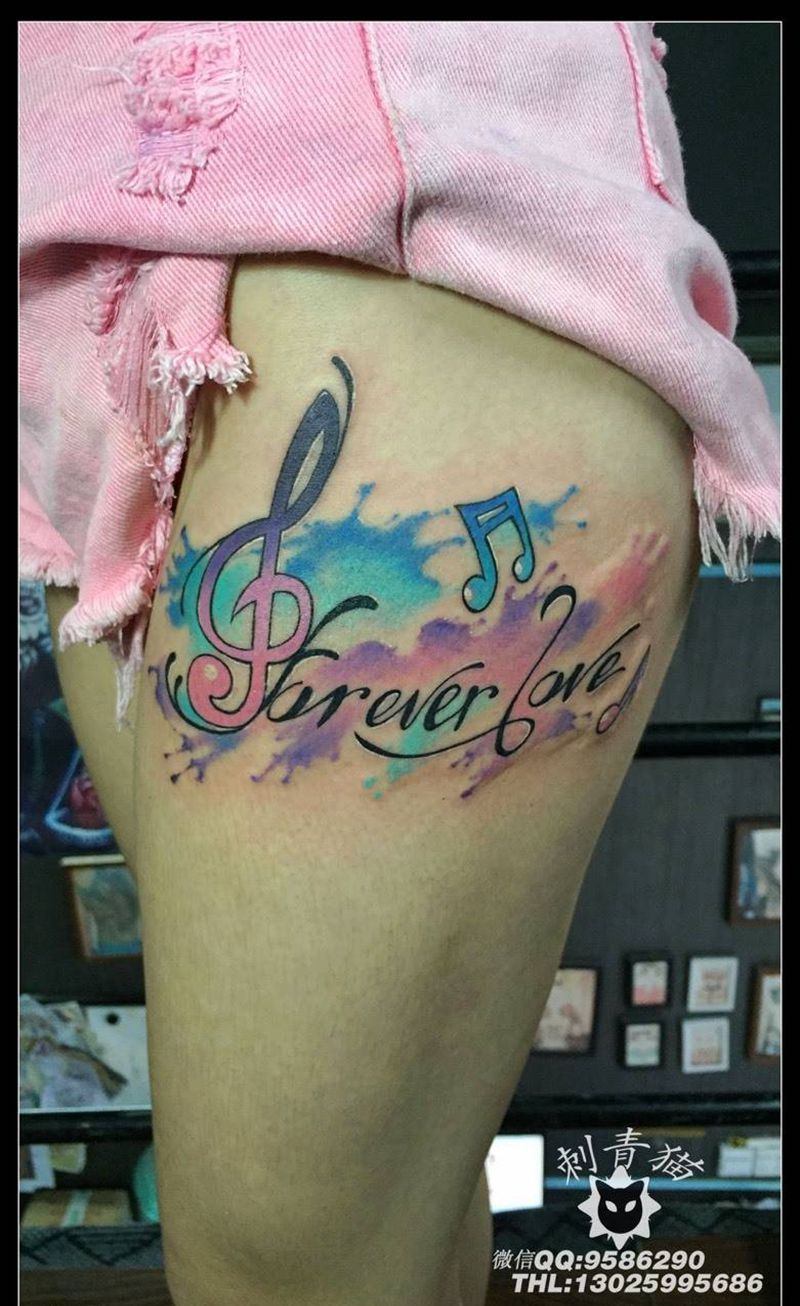 水彩音符纹身图片_成品腿部欧美字符水彩音符英文字母纹身图案