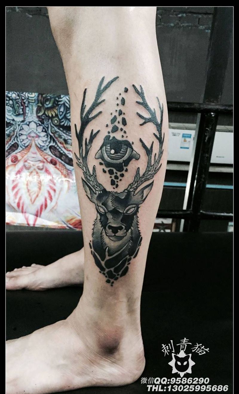 麋鹿纹身图片_成品脚部腿部欧美动物麋鹿纹身图案
