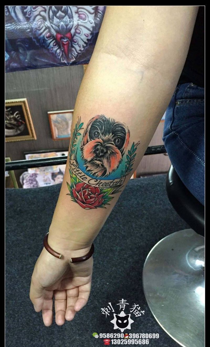 当前位置: 首页 >广西北海市纹身店-刺青猫纹身馆纹身图案>美女的爱犬.狗狗纹身纹身图片_成品手臂手部写实清新动物原创纹身图案
