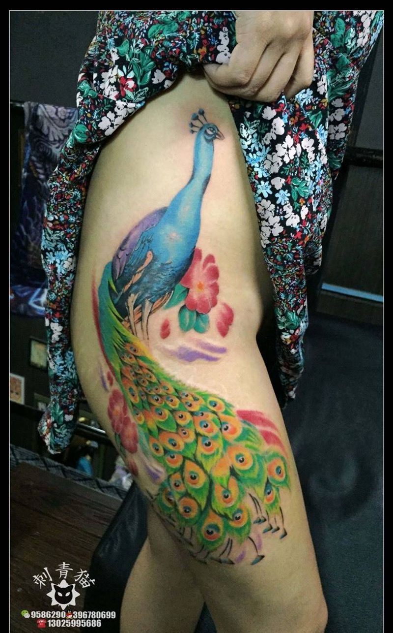孔雀纹身图片_成品腿部臀部腰部传统清新动物孔雀纹身图案