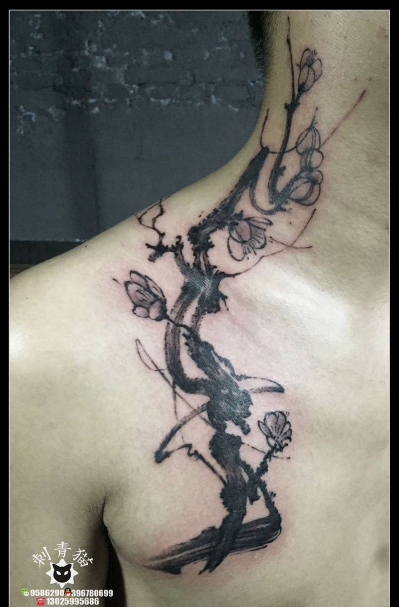 梅花纹身图片_成品肩部颈部传统清新植物纹身图案