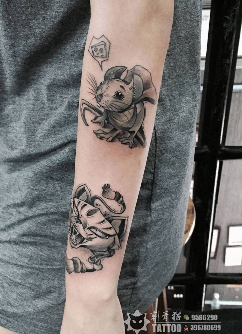 当前位置: 首页 >广西北海市纹身店-刺青猫纹身馆纹身图案>小老鼠.狐狸纹身图片_成品手臂手部传统清新动物老鼠狐狸纹身图案