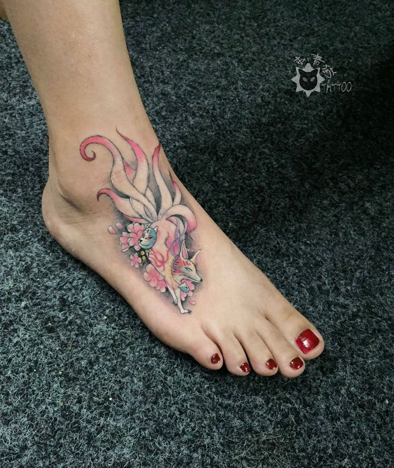 九尾狐纹身图片_腿部脚部新传统老传统狐狸九尾狐脚背纹身图案