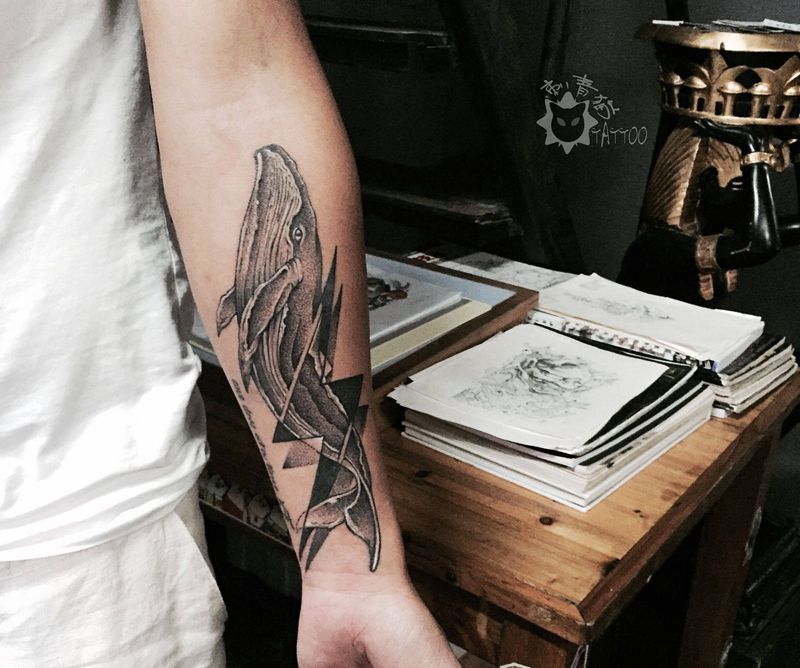 当前位置: 首页 >广西北海市纹身店-刺青猫纹身馆纹身图案>鲸鱼纹身图片_手部手臂几何点刺鲸鱼纹身图案
