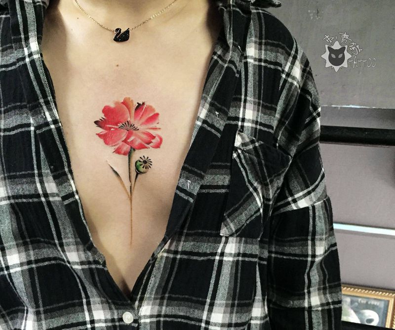 当前位置: 首页 >广西北海市纹身店-刺青猫纹身馆纹身图案>罂粟花纹身图片_胸部水彩New School罂粟花花朵纹身图案