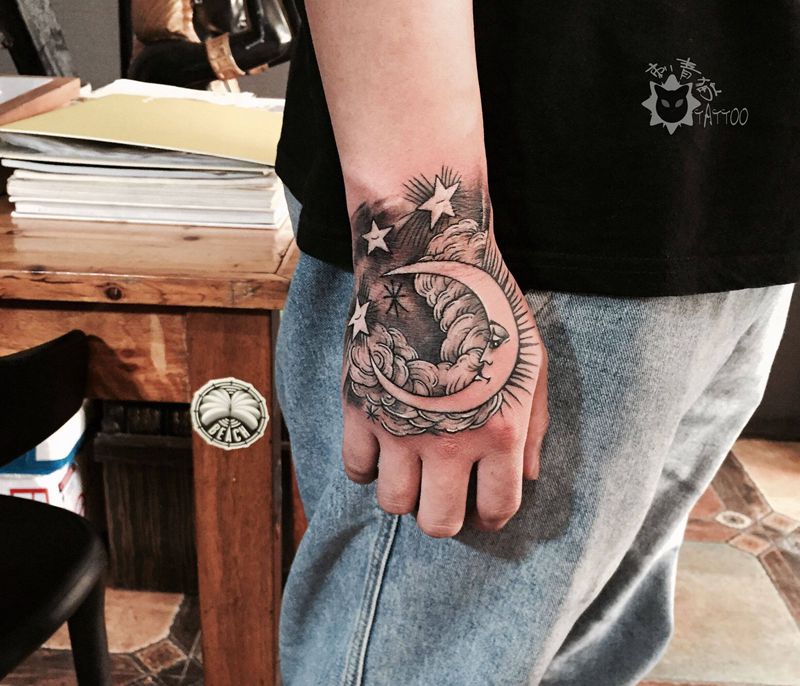 当前位置: 首页 >广西北海市纹身店-刺青猫纹身馆纹身图案>月亮纹身图片_手部点刺几何月亮手背纹身图案