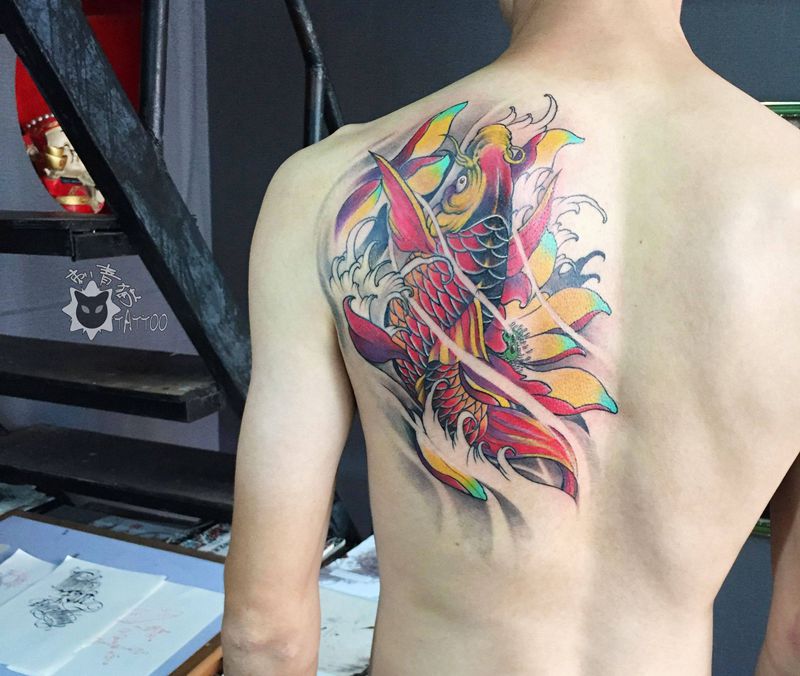 当前位置: 首页 >广西北海市纹身店-刺青猫纹身馆纹身图案>锦鲤纹身图片_背部老传统新传统鱼锦鲤莲花纹身图案