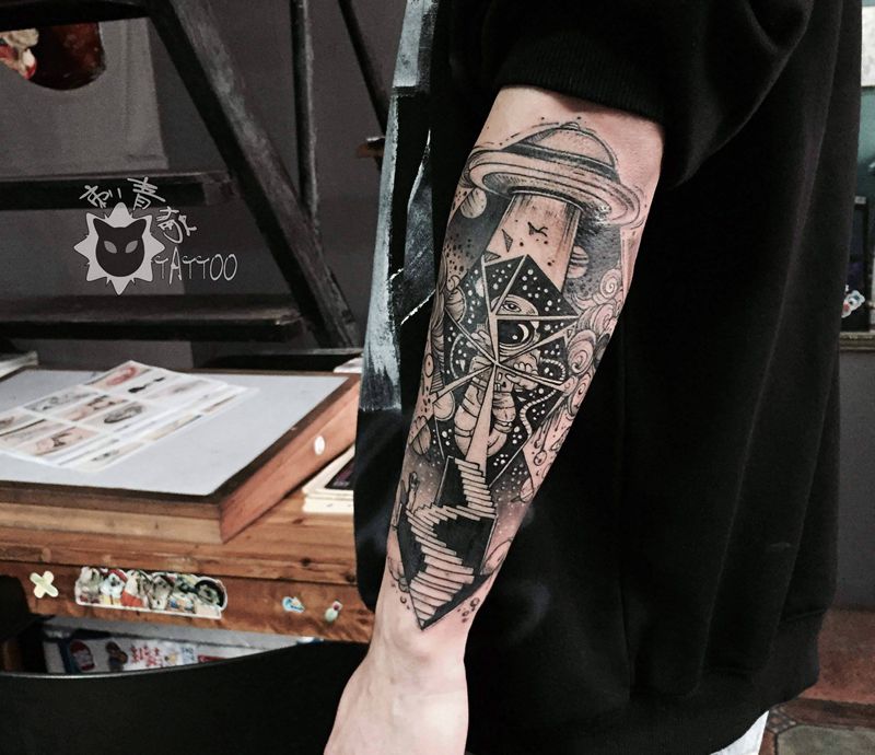 当前位置: 首页 >广西北海市纹身店-刺青猫纹身馆纹身图案>宇航员纹身图片_手部手臂点刺几何宇航员外星人宇宙纹身图案