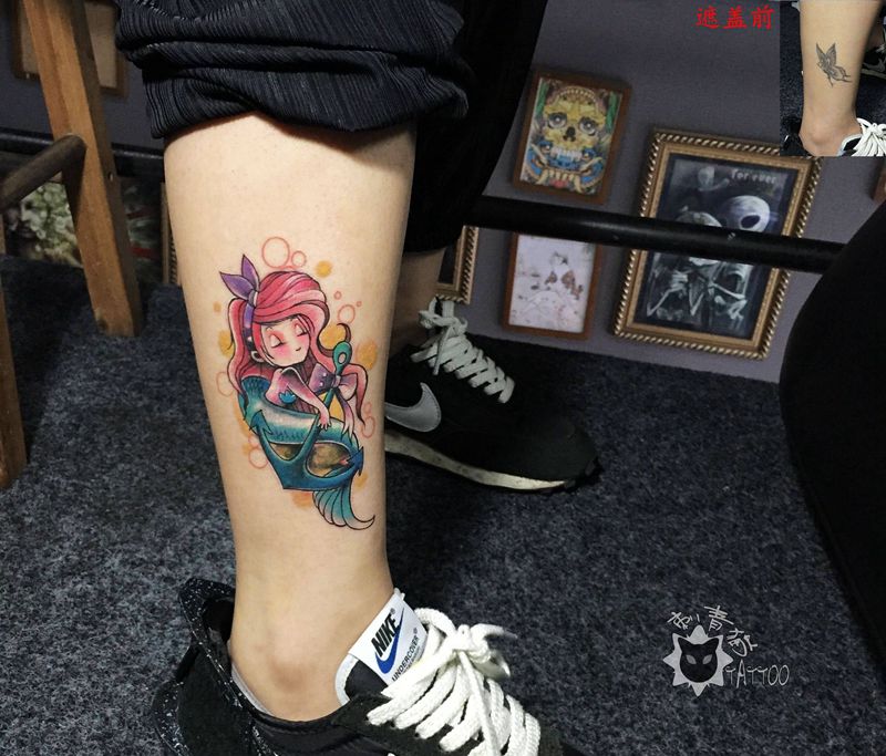 当前位置: 首页 >广西北海市纹身店-刺青猫纹身馆纹身图案>小遮盖.美人鱼纹身图片_腿部脚部水彩New School美人鱼船锚纹身图案