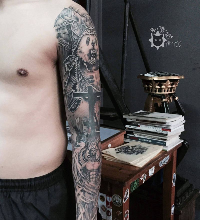 当前位置: 首页 >广西北海市纹身店-刺青猫纹身馆纹身图案>熊猫战士.纹身图片_手部手臂欧美写实New School熊猫天使花臂纹身图案