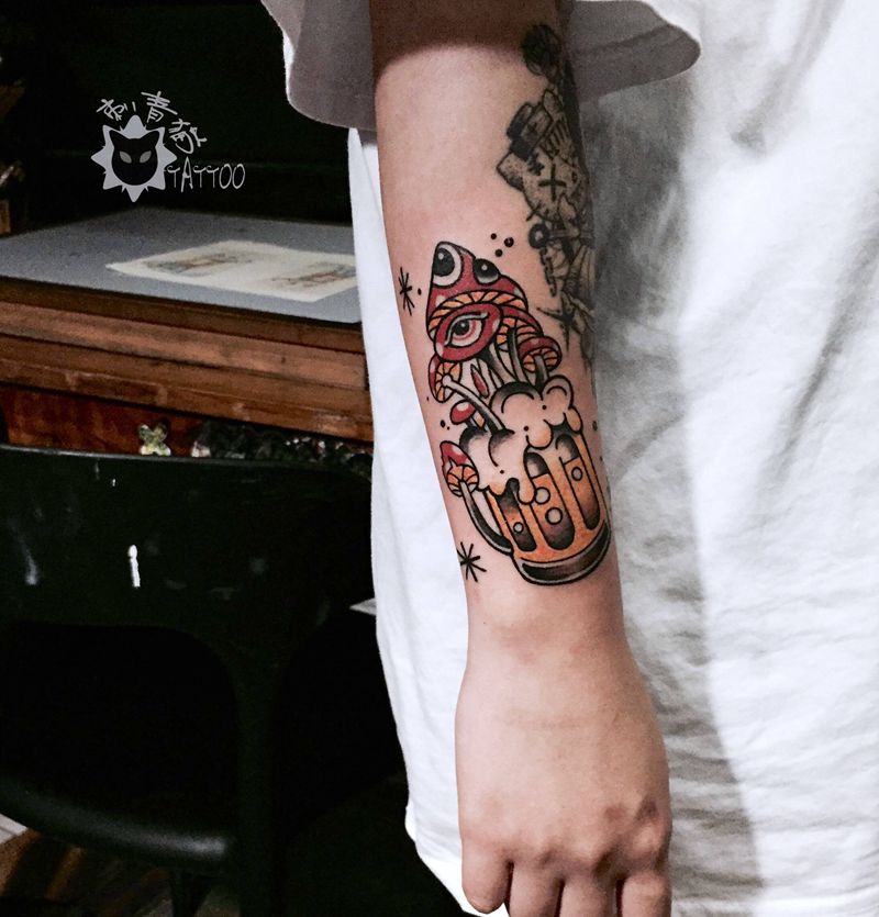 当前位置: 首页 >广西北海市纹身店-刺青猫纹身馆纹身图案>酒杯纹身图片_手臂手部Old SchoolNew School酒杯蘑菇纹身图案