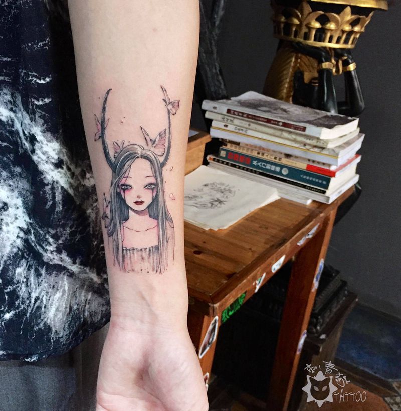 精灵纹身图片_手臂手部水彩水墨精灵小清新纹身图案