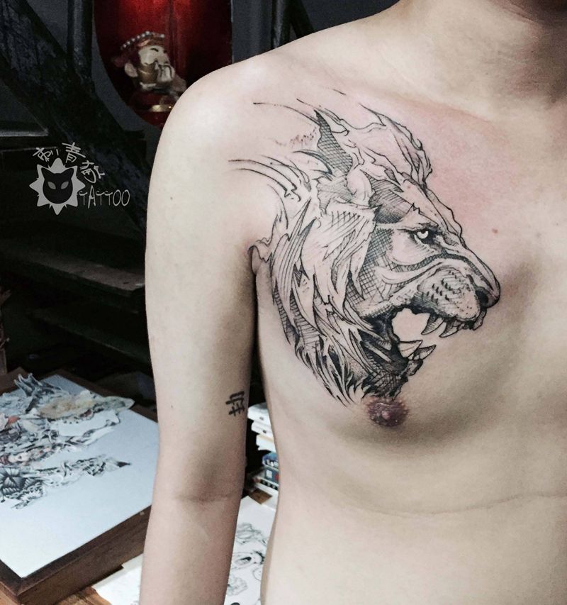 当前位置: 首页 >广西北海市纹身店-刺青猫纹身馆纹身图案>狮子纹身图片_胸部点刺几何狮子纹身图案