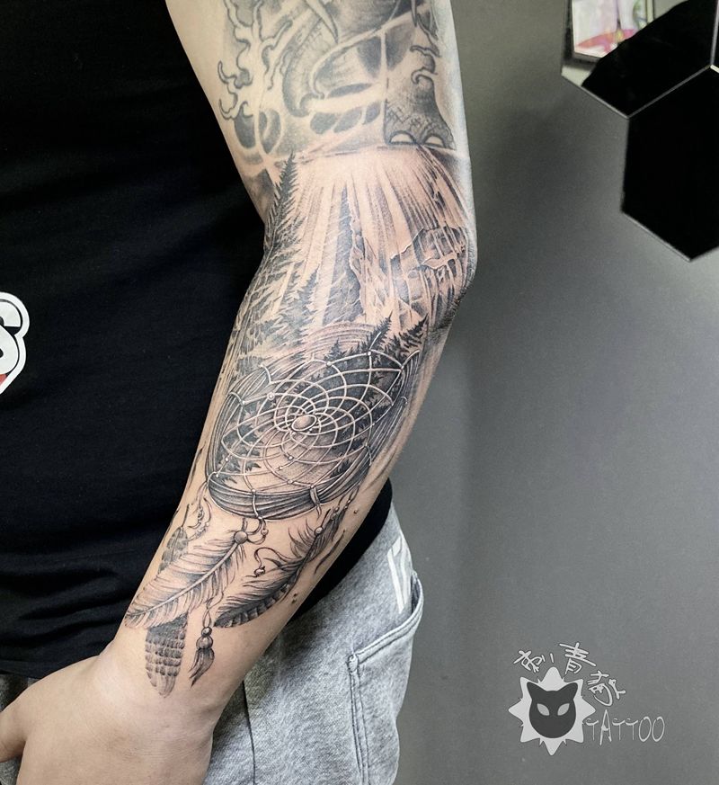 当前位置: 首页 >广西北海市纹身店-刺青猫纹身馆纹身图案>捕梦网纹身图片_手部手臂欧美写实点刺捕梦网羽毛树林纹身图案