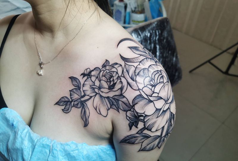 素花纹身图片_肩部点刺纹身图案