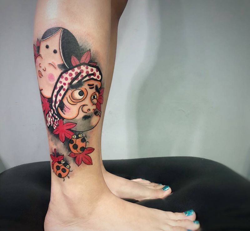• T包小腿吹火男+阿多福纹身图片_腿部老传统新传统吹火男阿