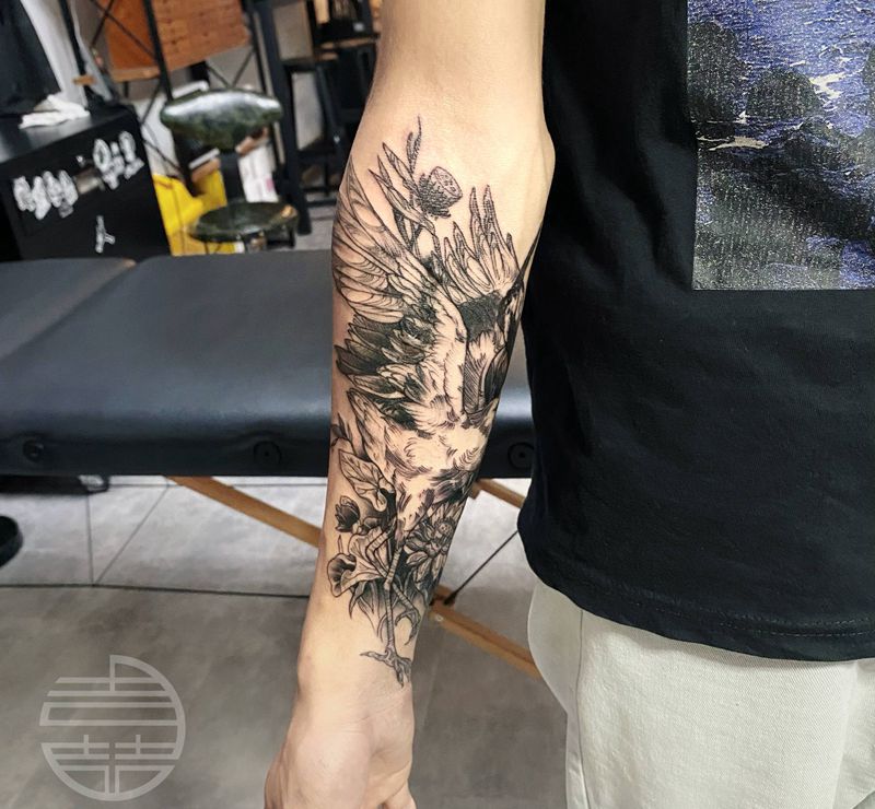 当前位置: 首页 >广西北海市纹身店-嚞刺青纹身图案>线条鹤遮盖纹身图片_手臂纹身图案