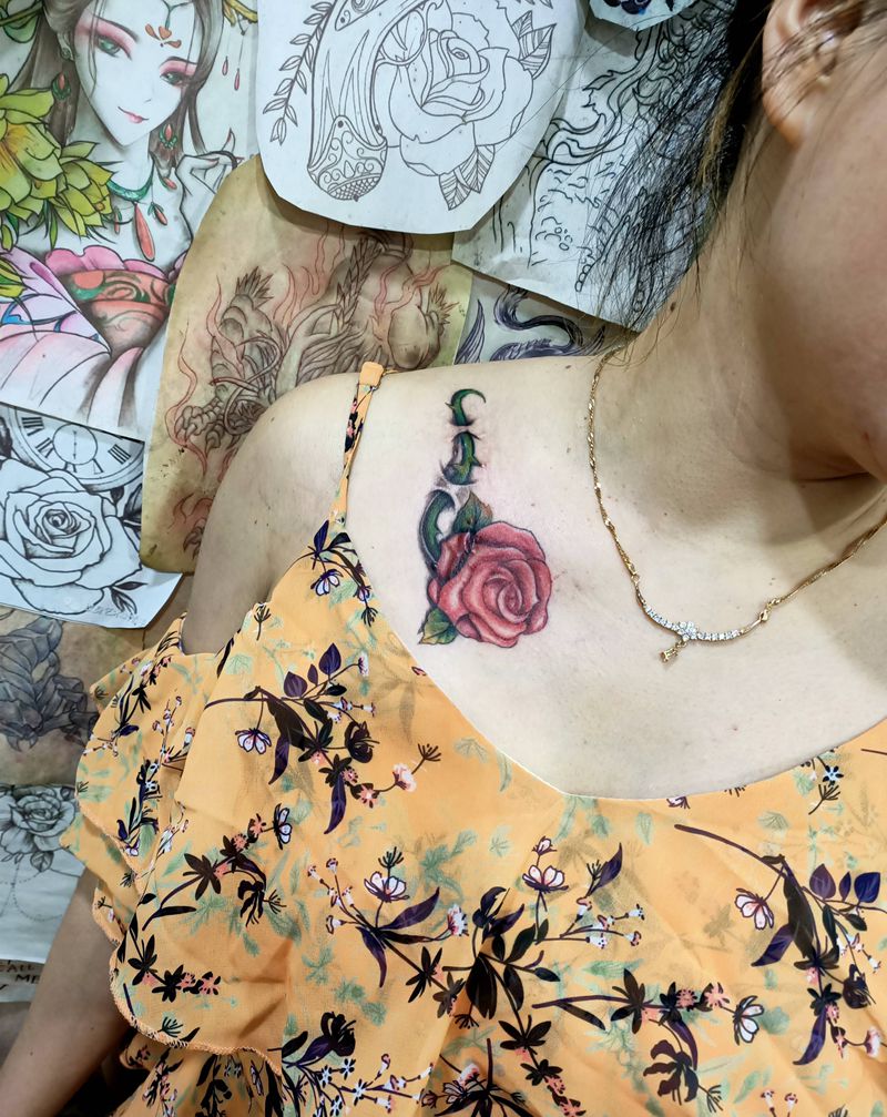 带刺玖瑰纹身图片_胸部纹身图案