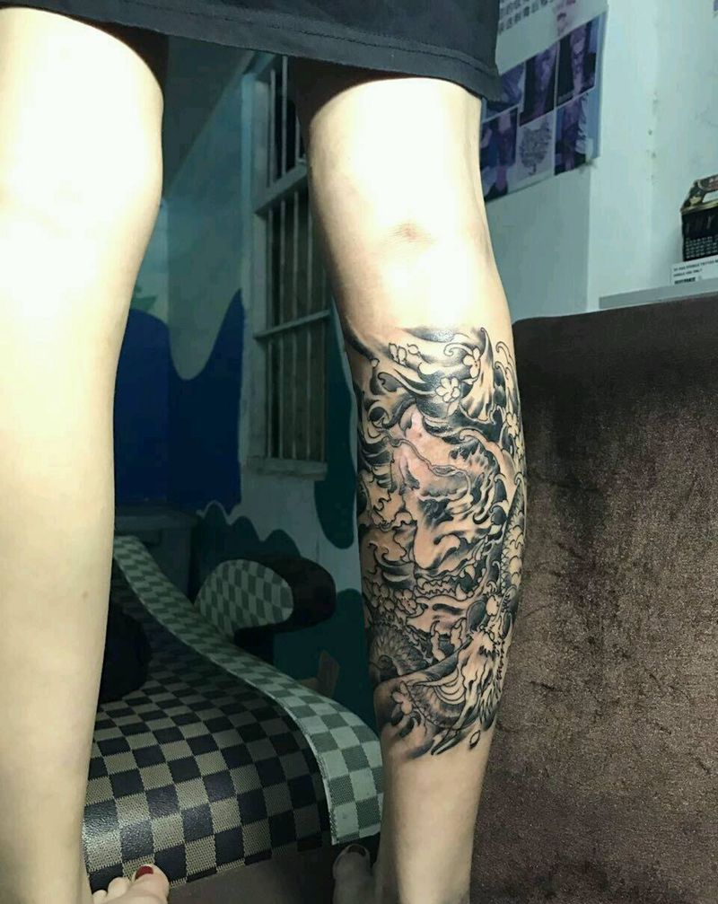 • T网红王老大花腿龙纹身图片_腿部新传统纹身图案