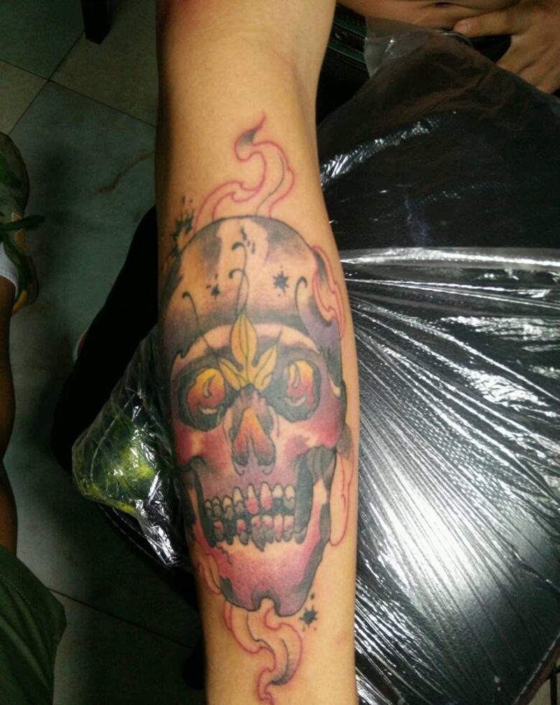 当前位置: 首页 >广西北海市纹身店-雷恩刺青店纹身图案>骷髅纹身图片_手臂欧美人物成品纹身图案