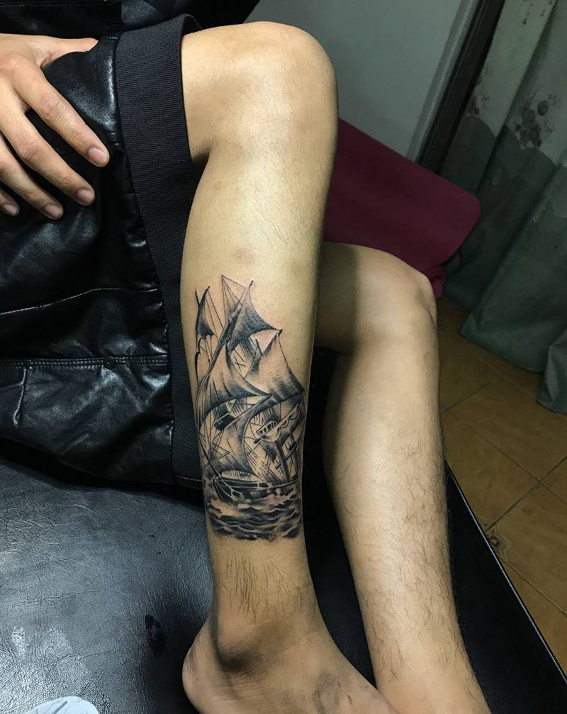 船纹身图片_腿部写实帆船小腿纹身图案