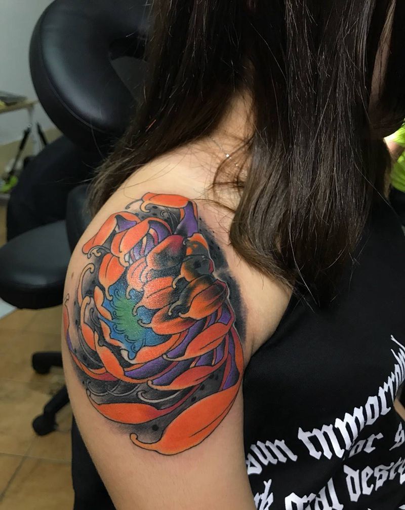 当前位置: 首页 >广西北海市纹身店-雷恩刺青店纹身图案>菊花纹身图片_手臂传统植物菊花纹身图案