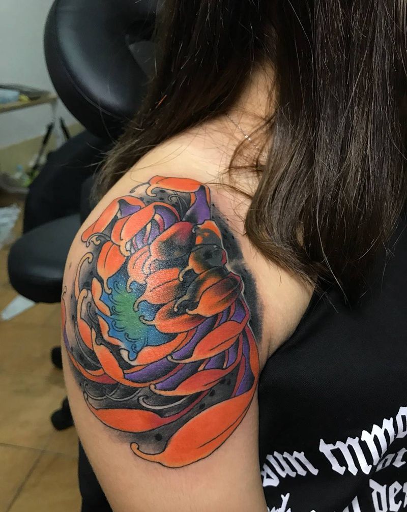 当前位置: 首页 >广西北海市纹身店-雷恩刺青店纹身图案>菊花纹身图片_手臂传统植物菊花纹身图案