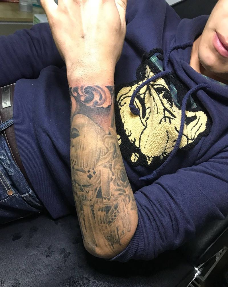 当前位置: 首页 >广西北海市纹身店-雷恩刺青店纹身图案>手臂添加纹身图片_成品手臂欧美肖像写实几何纹身图案