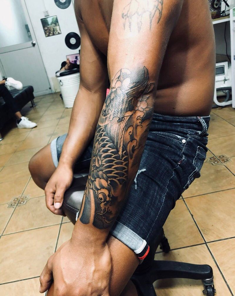 当前位置: 首页 >广西北海市纹身店-雷恩刺青店纹身图案>鲤鱼花臂纹身图片