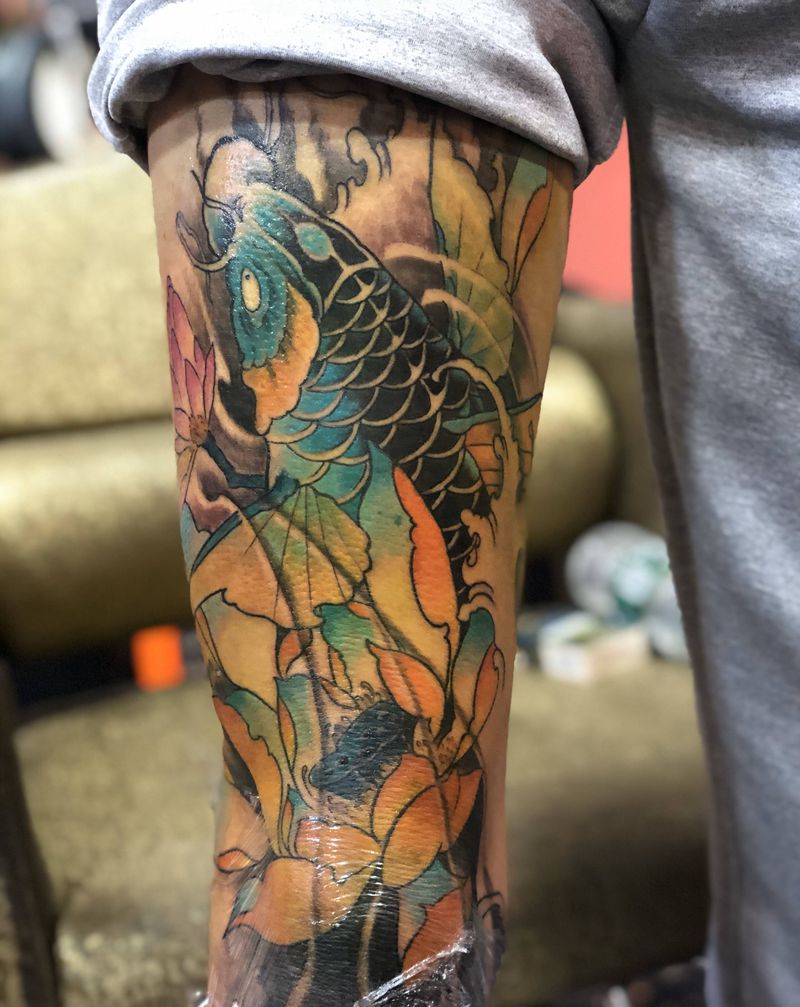 当前位置: 首页 >广西贵港市纹身店-深度刺青纹身图案>彩色鲤鱼纹身图片_腿部新传统纹身图案