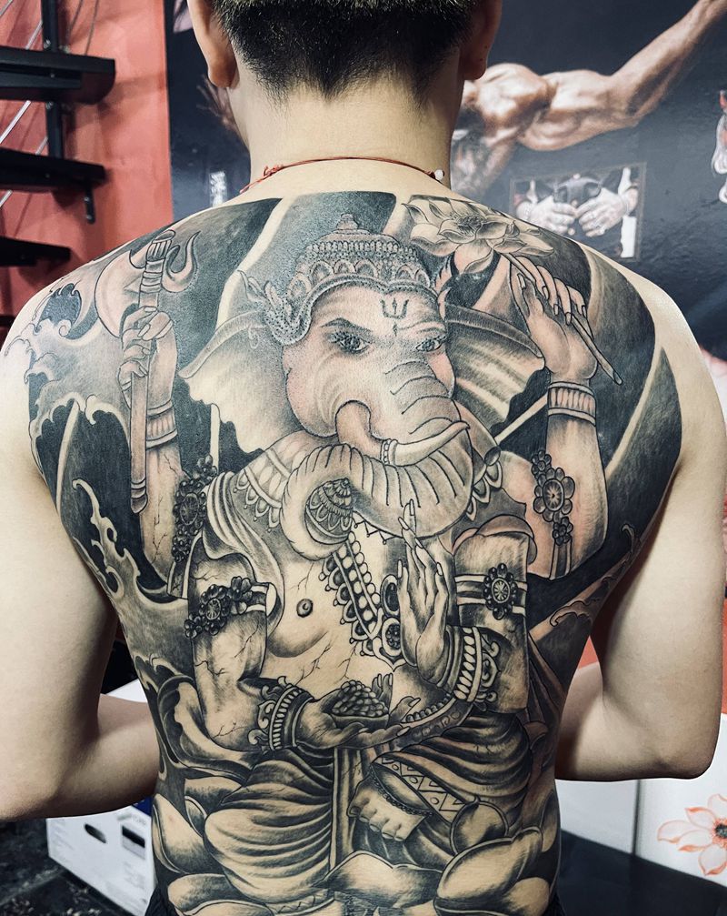 当前位置: 首页 >广西贵港市纹身店-深度刺青纹身图案>象神纹身图片_背部纹身图案