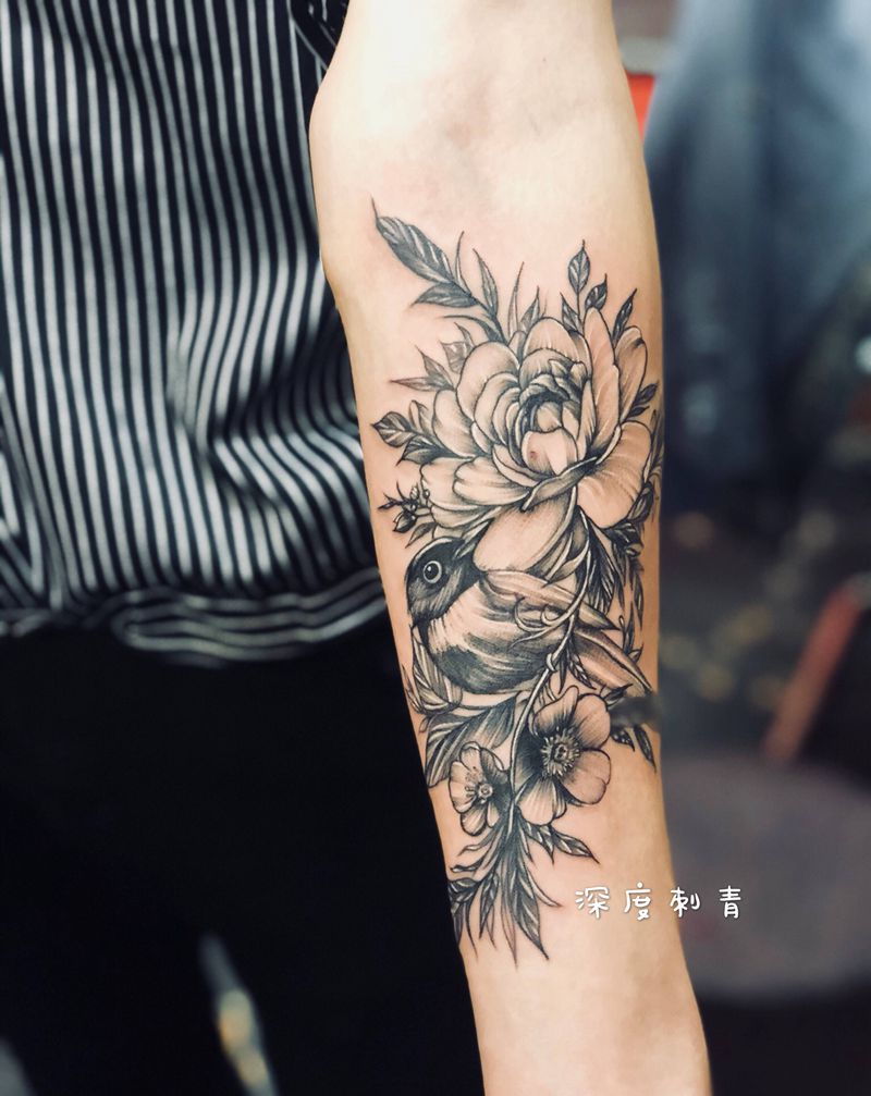 当前位置: 首页 >广西贵港市纹身店-深度刺青纹身图案>素花与鸟纹身图片_手臂欧美写实纹身图案