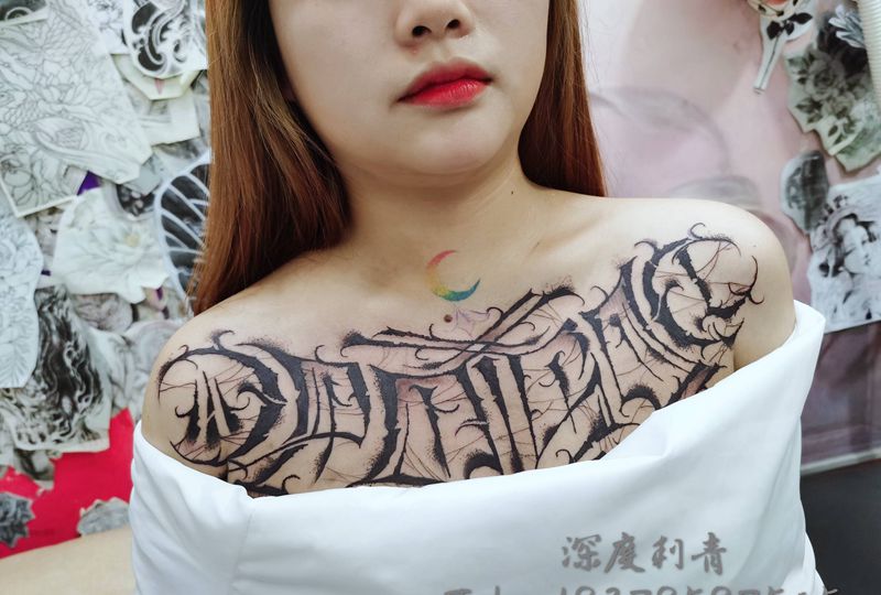 当前位置: 首页 >广西贵港市纹身店-深度刺青纹身图案>花体花胸纹身图片_胸部New School花体字纹身图案