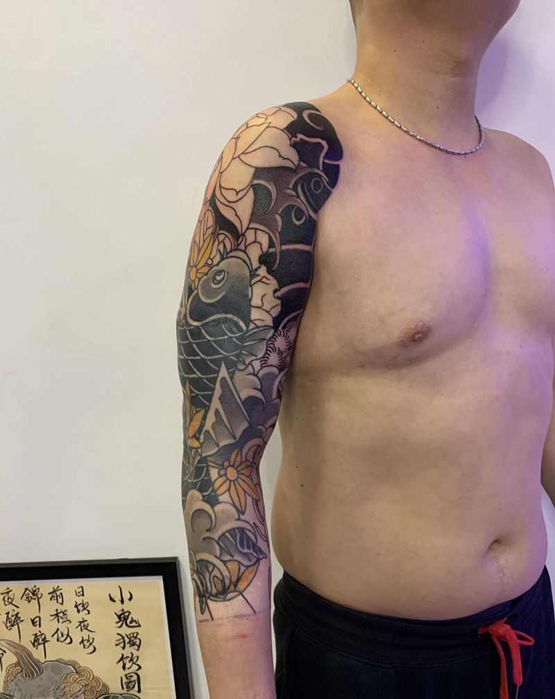 当前位置: 首页 >海南省海口市纹身店-八门刺青纹身图案>鲤鱼荷花纹身图片_手臂老传统纹身图案