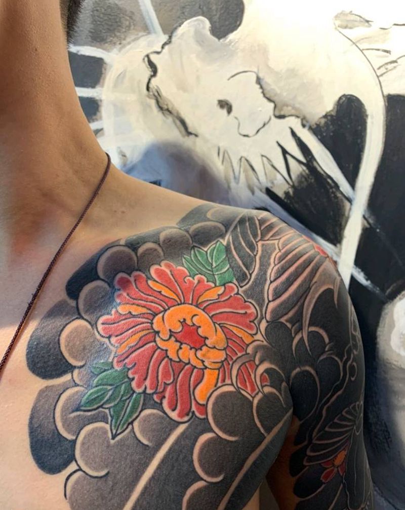 日式传统半胛纹身图片_胸部手臂老传统纹身图案