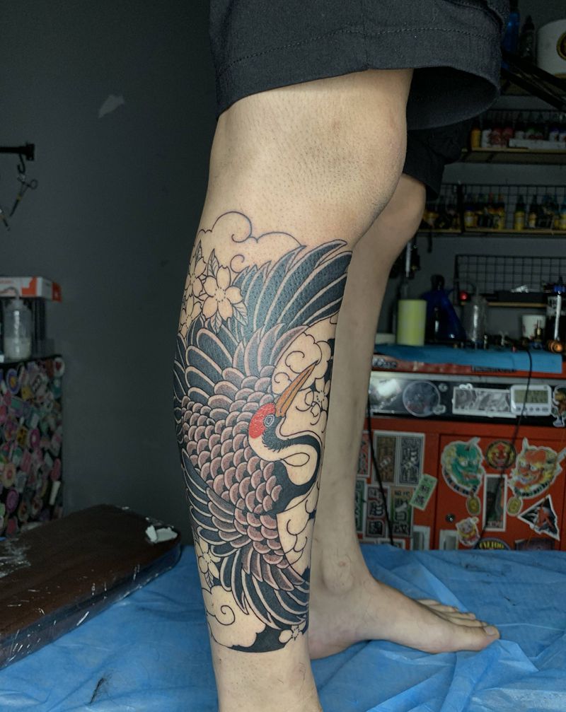 仙鹤牡丹包小腿纹身图片_腿部老传统纹身图案