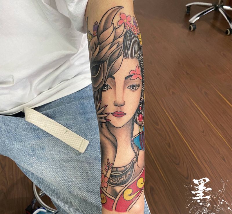 当前位置: 首页 >广西贵港市纹身店-墨匠刺青纹身图案>艺妓纹身图片_手部手臂新传统纹身图案