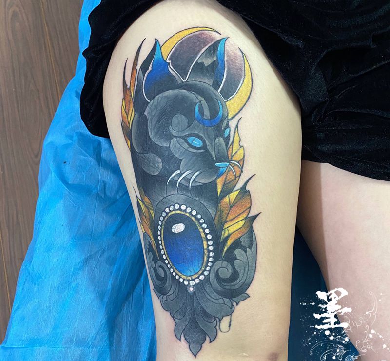 当前位置: 首页 >广西贵港市纹身店-墨匠刺青纹身图案>星空猫彩色覆盖纹身图片_腿部脚部New SchoolOld School纹身图案