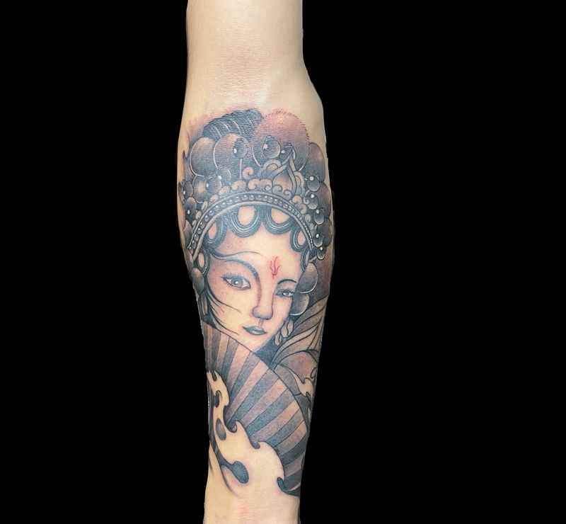 当前位置: 首页 >广西贵港市纹身店-墨匠刺青纹身图案>中国风花旦纹身图片_手臂手部新传统纹身图案