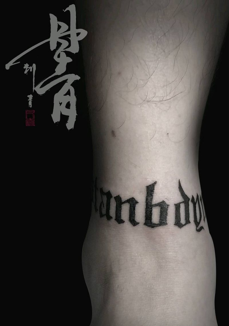当前位置: 首页 >海南省海口市纹身店-海口喜鹊刺青艺术工作室纹身图案>英文环腿纹身图片_脚部字符成品纹身图案