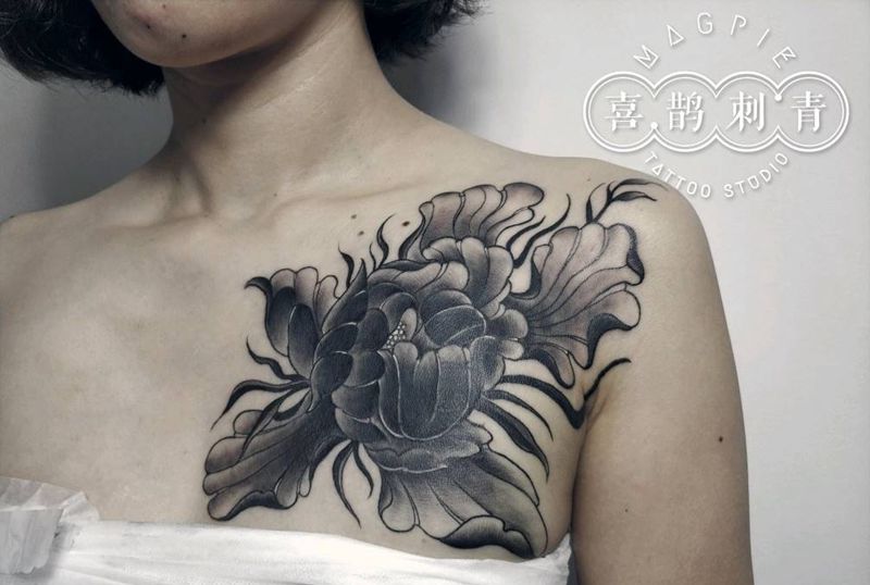 牡丹遮盖纹身图片_胸部纹身图案