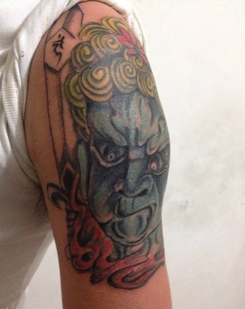 当前位置: 首页 >海南省海口市纹身店-艺莹刺青纹身图案>遮盖,大黑天纹身图片_成品肩部传统鬼神纹身图案