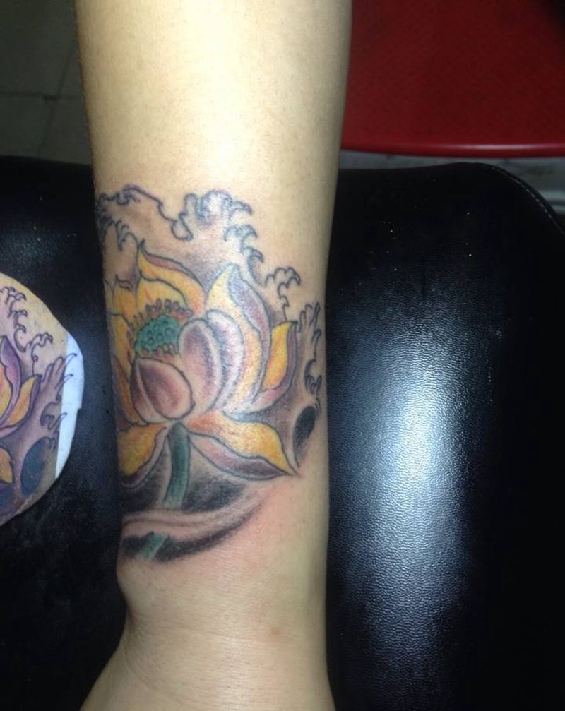 当前位置: 首页 >海南省海口市纹身店-艺莹刺青纹身图案>荷花纹身图片_成品手臂传统植物纹身图案