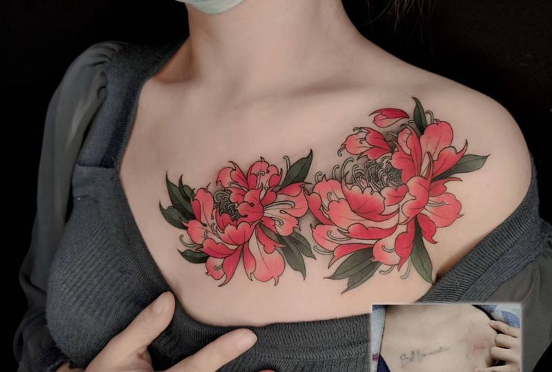 牡丹花-遮盖【丰兄作品】纹身图片_胸部新传统原创牡丹遮盖纹身图案