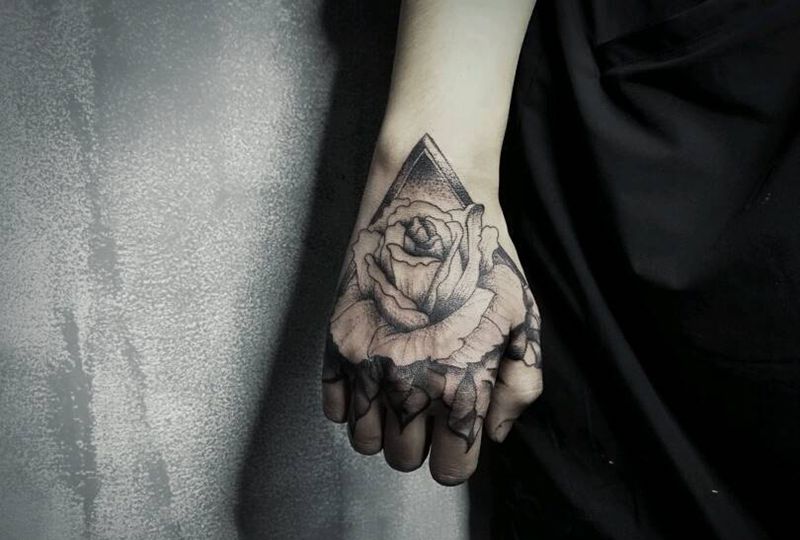 丰作品 玫瑰纹身图片_手部欧美几何植物玫瑰成品纹身图案