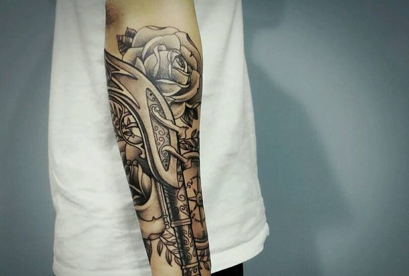 当前位置: 首页 >重庆市纹身店-木良拾贰文身艺术工作室纹身图案>黑灰newschool纹身图片_手臂欧美静物原创手枪指南针成品纹身图案