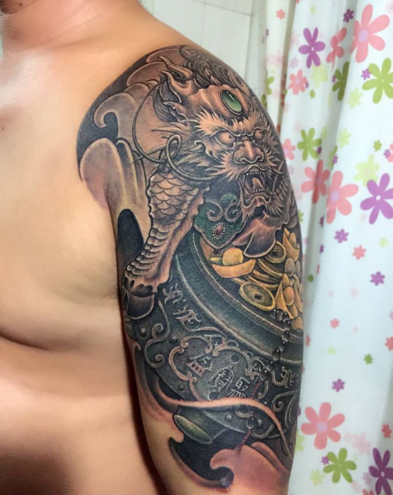 • T网红王老大花腿龙纹身图片_腿部新传统纹身图案