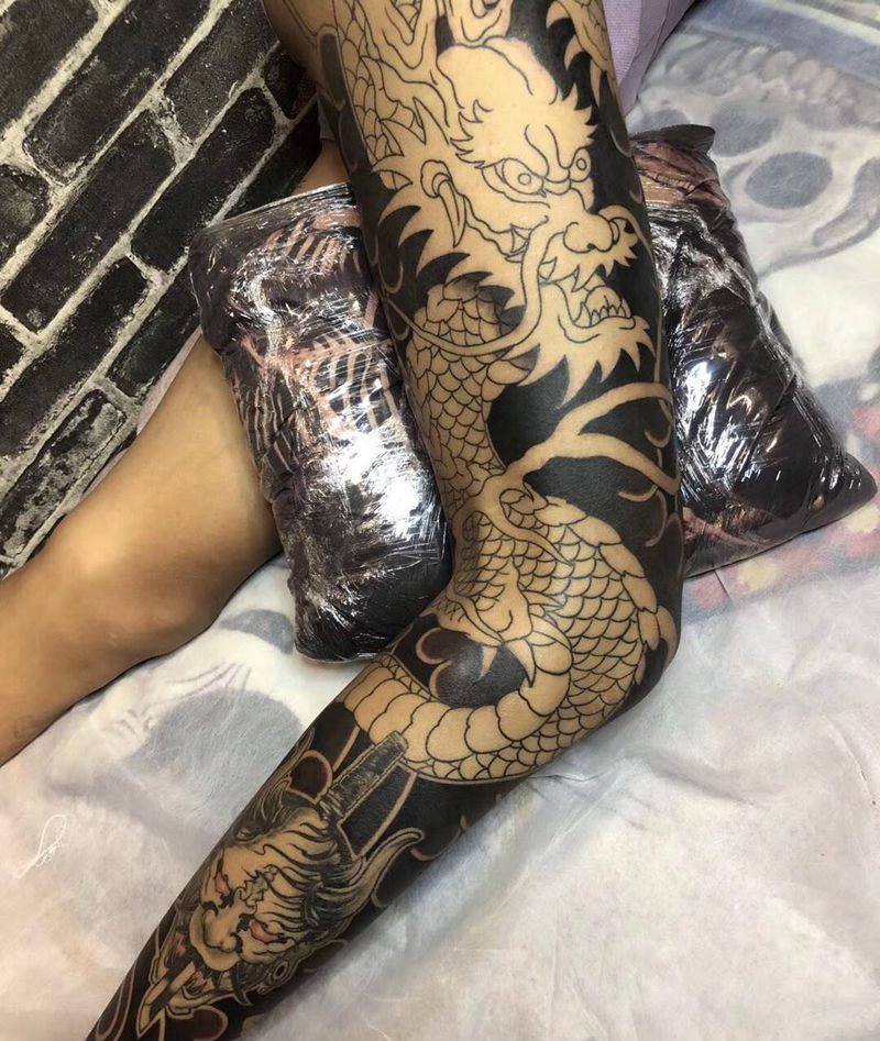 • T网红王老大花腿龙纹身图片_腿部新传统纹身图案